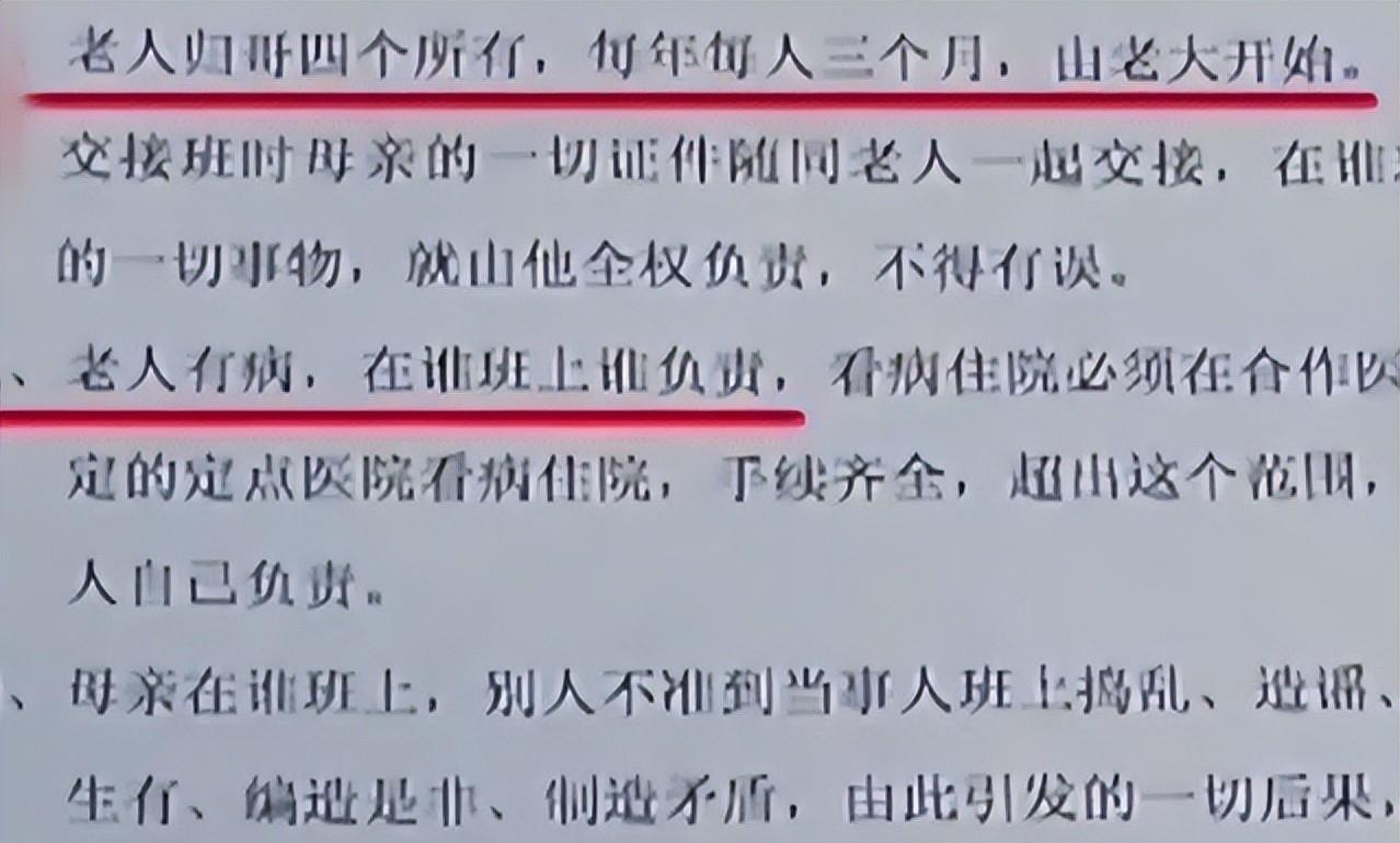 赡养期间的一切费用由赡养人负责,而兄弟们最关心的房产证,也随着母亲一起每3个月交接一次。