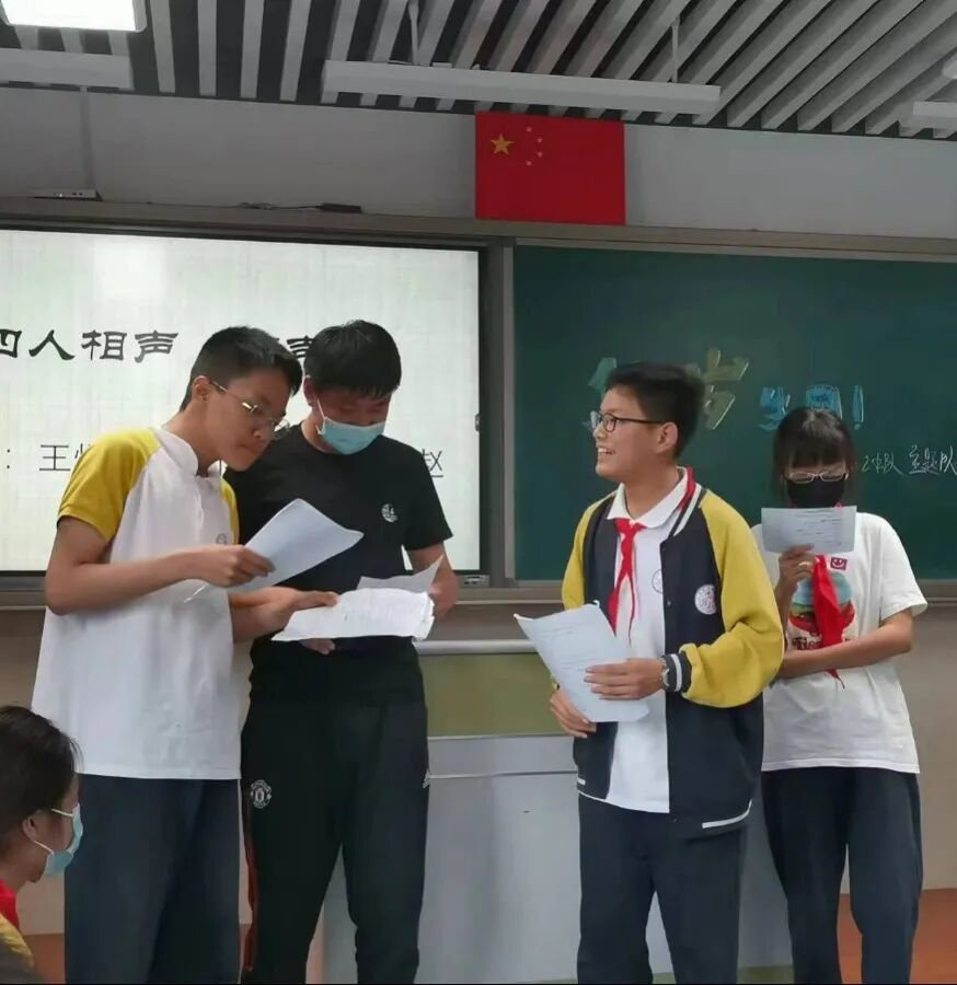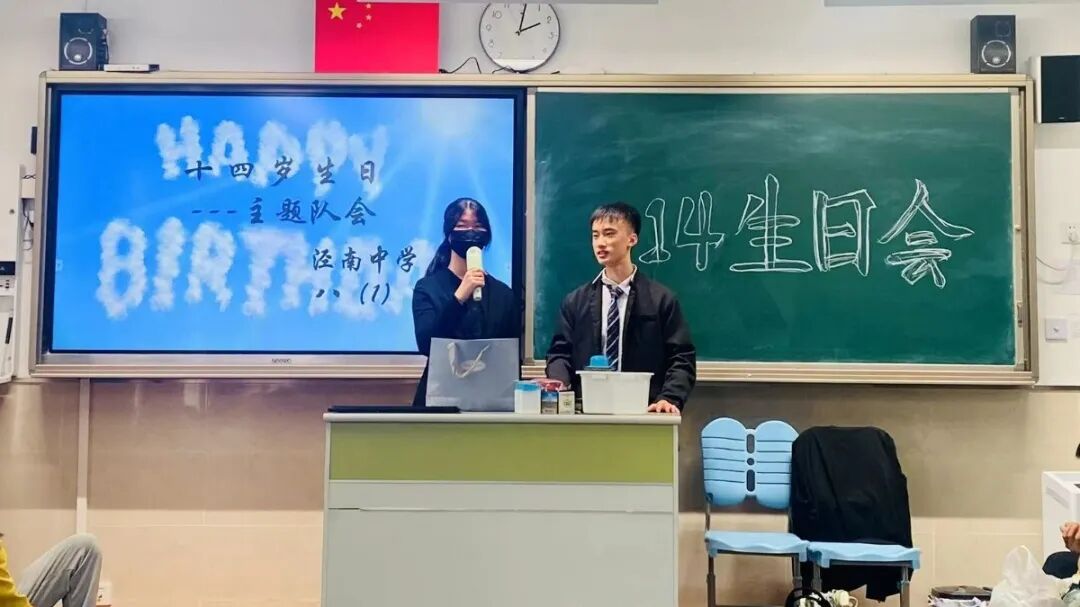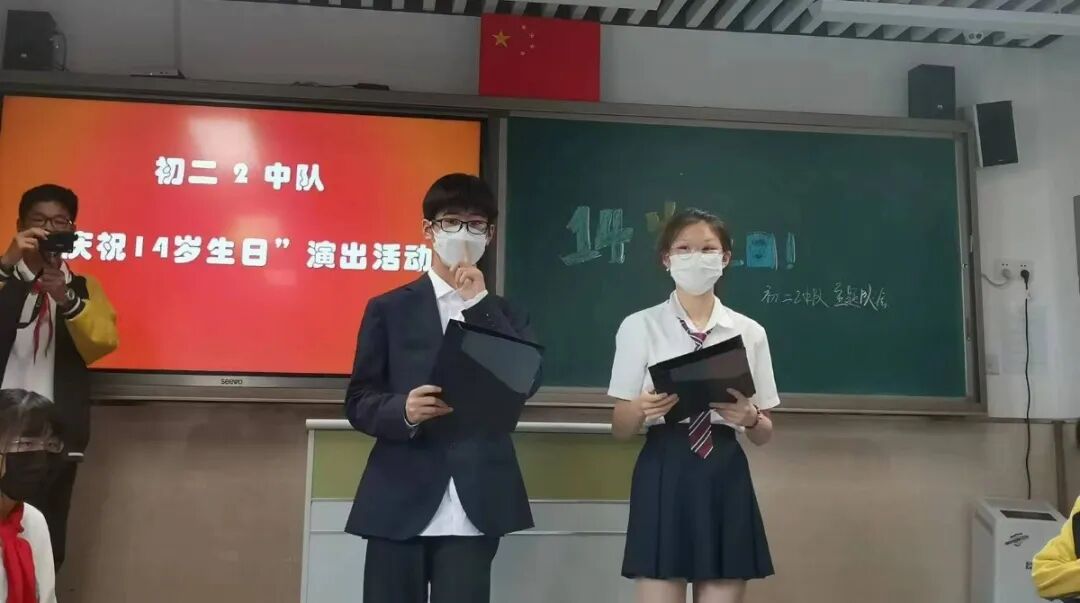 伴随着中队辅导员的讲话,队员们纷纷参与到欢庆活动中。初二年级的辅导员们有的精心录制了视频,有的现场讲演,表达了对于初二年级所有队员殷殷嘱托,希望队员们在十四岁之际,能够成为有理想、有担当的新时代少年。首先要感谢的是辅导员们的谆谆教导,其次要感谢父母的养育之恩。之后队员们分享了蛋糕,在一片轻松愉悦的氛围中观赏队员们精心策划的节目。