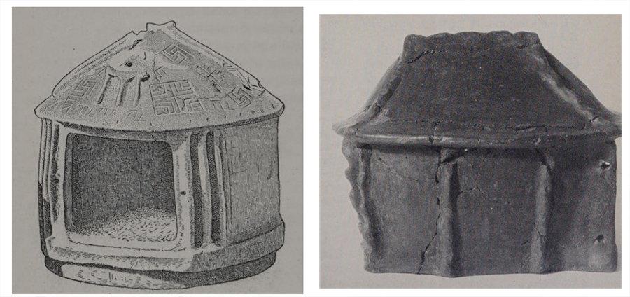 早期罗马人的墓葬,都有一种小庙样子的骨灰盒,上面还有万字符。这种小房子有些是圆形的,可以解释为凯尔特人的房子,有些就直接是中式小庙,还带点飞檐,这让西方考古家大感疑惑,这个万字符号考证下去最早也是一种黄人在用。万字符是希特勒选的雅利安Logo,也出现在塞浦路斯等遗址的陶器上,开始有学者把这个符号视为白种人文明起源的象征物,据说也是印度-雅利安人的标识,但是考证到印度的更早前,这是那加人和西藏常用的图腾符号,开始会解释为这是希腊文化的传播,但是在北美洲的印第安人遗址也发现这个万字符,北美洲一些印第安人把这个符号看做一种神秘力量,而且也是玛雅人曾经用的图腾。印第安人和大陆分隔时间很久,从来没有受过希腊文化影响,所以这个符号会是早期人类传下来的,这些早期人类中没有毛人。