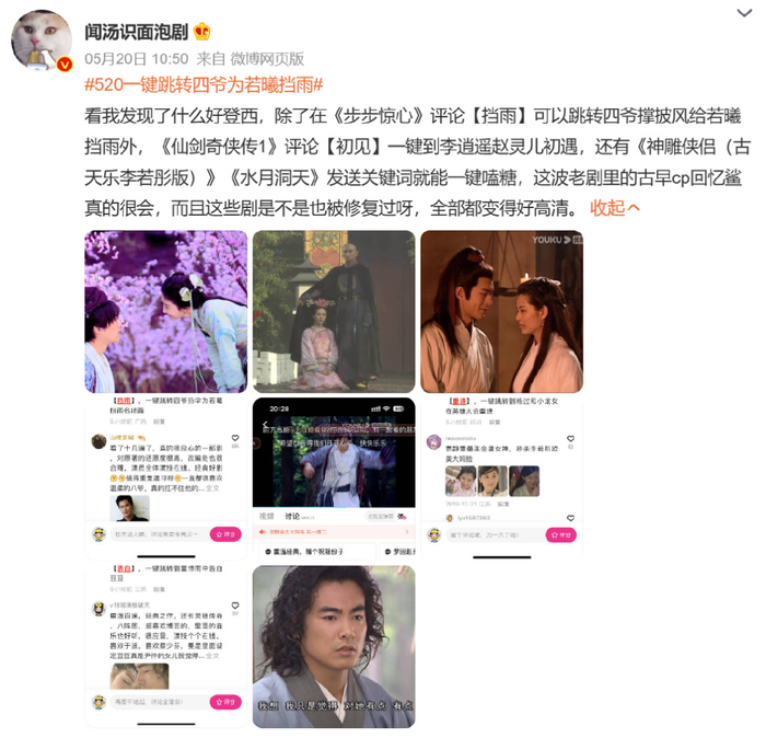 5月份的“520”,更多老剧喜提跳转:《步步惊心》、《仙剑奇侠传1》、95版《神雕》、《水月洞天》……明里是童年CP回忆杀,暗里让优酷狠狠秀了一把经典老剧储备。