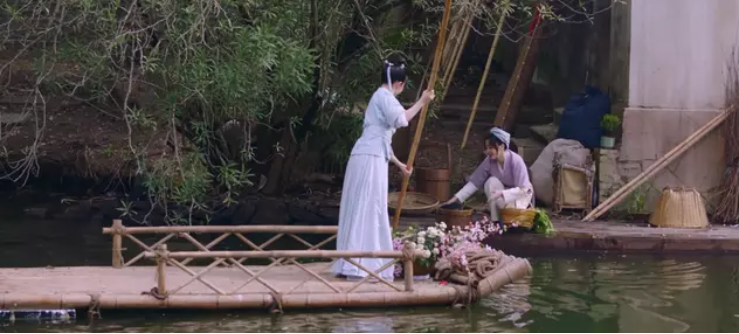 初期,赵盼儿和孙三娘在钱塘江边茶坊,小船悠悠游荡绿波之上,水波潋滟,风光无限。