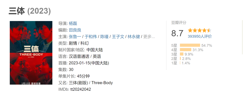 更何况从预告片以及演员表来看,这部扎根东方色调的《三体》,角色大部分都是老外胜任,演员方面就不可能太贴合,给老外看可以,反正他们不懂,给中国剧民来看,那就是特别的别扭。