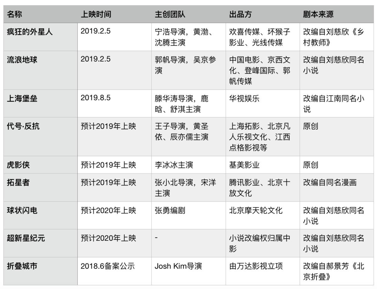 2019年及以后上映的中国科幻影片。根据公开资料整理从剧本上看,《上海堡垒》虽然属于软科幻,但作者江南的人气不亚于刘慈欣,算得上大IP。从钱和技术上看,《上海堡垒》的总投资达3.6亿,负责《上海堡垒》后期和视效的公司也都是大厂。后期制作(post production)部分由北京天工异彩影视科技有限公司完成。早在8年前,他们就承担了《画皮2》的特效制作,技术问题不在话下。而视觉效果(visual effect)部分则与美国、韩国、俄罗斯等多国团队进行合作,其中韩国视效公司Macrograph还参与过《流浪地球》的制作。