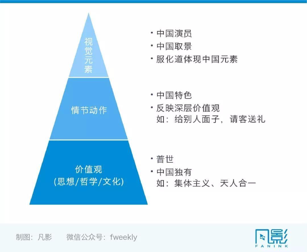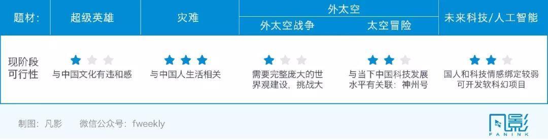 “中国元素”融入的违和感,存在于视觉元素、情节动作和价值观三个层面。例如,演员就属于视觉元素之一。凡影指出,在选角方面,新人演员和演技派明星更适合国产科幻片。“新人的陌生感有助于观众产生距离感,观众对新人演员不存在刻板印象。而能够塑造多种角色,在观众心中没有被“标签化”的演技派演员,也可以胜任有距离感的角色。”《流浪地球》的男主演之一,屈楚萧,就同时满足了距离感和新鲜感。而《上海堡垒》的选角无疑是失败的。观众对鹿晗过于熟悉,他还长着一张偶像小生的脸;舒淇以爱情片见长,慵懒美人的长相也缺乏女指挥官的笃定感;最要命的是,他们二人之间实在没什么cp感,舒淇看起来就像鹿晗的小姨。在情节动作上,凡影咨询指出,“超级英雄”、“外太空”等题材与我们的文化和科技水平相去较远,观众较难产生共情,是需要谨慎选择的题材。而“灾难”“喜剧”等题材则是国产科幻片题材的最优选择。此外,剧中人物的行为也应符合中国人的为人处世之道。