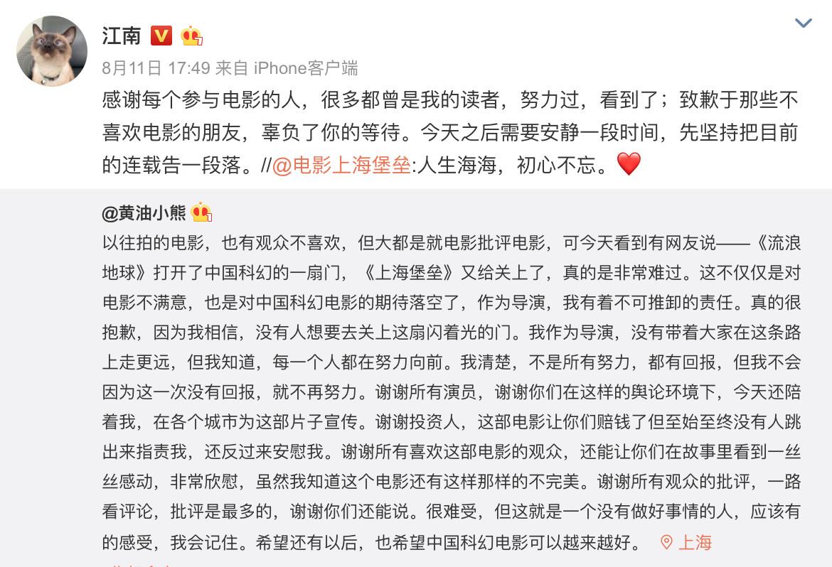 文 | 史圣园编辑 | 方婷“《流浪地球》打开了中国科幻的一扇门,《上海堡垒》又给关上了。”面对网友这样的评价,导演滕华涛坦言“非常难过”。“这不仅仅是对电影不满意,也是对中国科幻电影的期待落空了。”“真的很抱歉,因为我相信,没有人想要去关上这扇闪着光的门。我作为导演,没有带着大家在这条路上走更远,但我知道,每一个人都在努力向前。”滕华涛在微博中写道。随后,作者江南也公开致歉:“辜负了你的期待。”