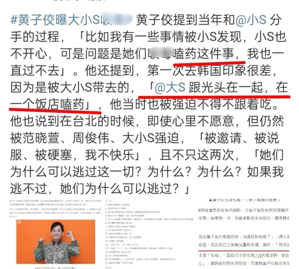 据黄子佼透露,他当年和小S分手时,想到大小S嗑药,他内心一直过不去。还有他第一次去韩国印象很差,因为被是被大小S带去的,他看到大S与具俊晔在一起嗑药,光头太壮,黄子佼只能被强迫吃药。