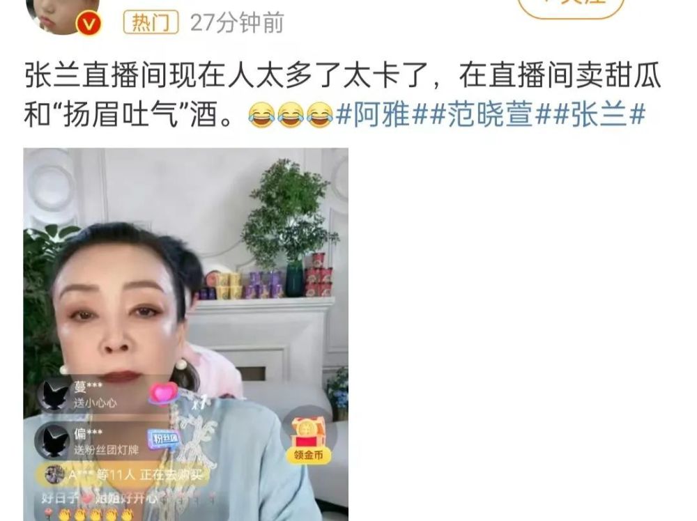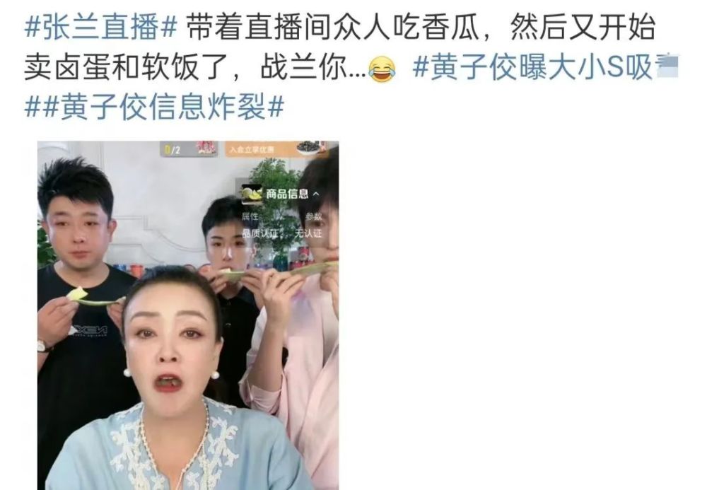 正当大家议论纷纷之时,张兰开了直播,也立马登上了热搜。在直播间,张兰笑容灿烂,各种内涵大小S,比如放的音乐是《好日子》,还卖起了甜瓜和杨梅汁,意指扬眉吐气。