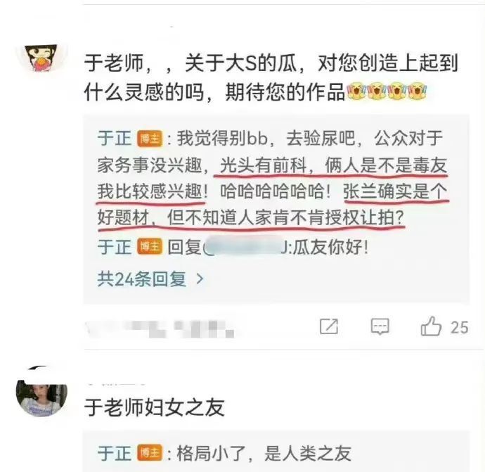 如今,因为黄子佼的爆料,大小S嗑药的事情再被提及,真假难辨,有网友建议她们去做尿检,以此来证明清白,著名编剧于正也这么提议过,他还说光头有前科。