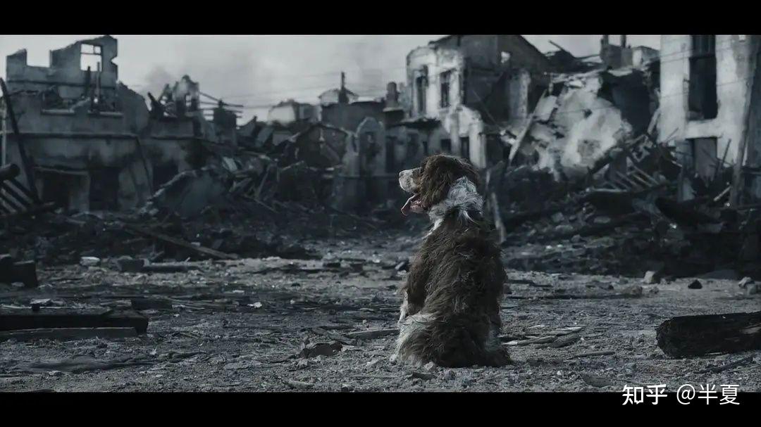 另外还有那两只狗,1938年9月广州沦陷前夕那只日本轰炸机被取名罗斯福的狗和那只废墟中跛着一条腿跑去躲雨的中国的狗。导演用对比的修辞手法赋予寓意。国民党统治下的广州持续一年多的轰炸死了成千上万的人,何先生是侥幸活下来的人,废墟中的那只狗躲雨被国民党军阀拿着枪把往外赶,可怜兮兮,几近哀求的眼神渴求留下来,却被另一个士兵从怀里抛出的一块馍引了出去,最终死在了大雨里。