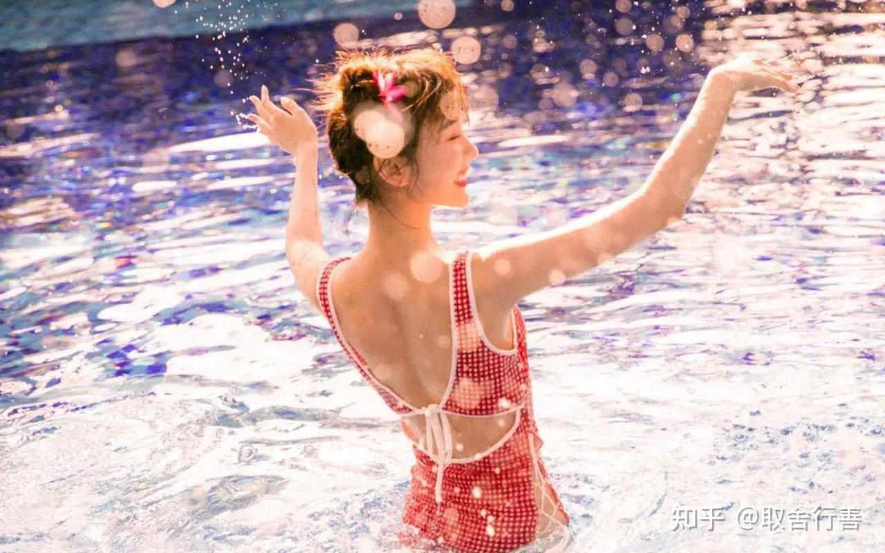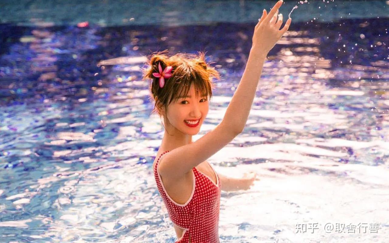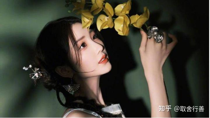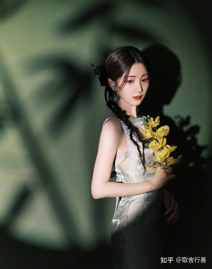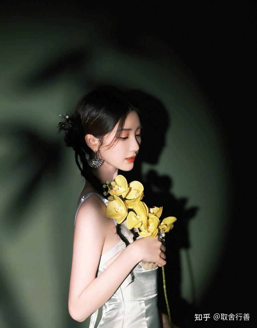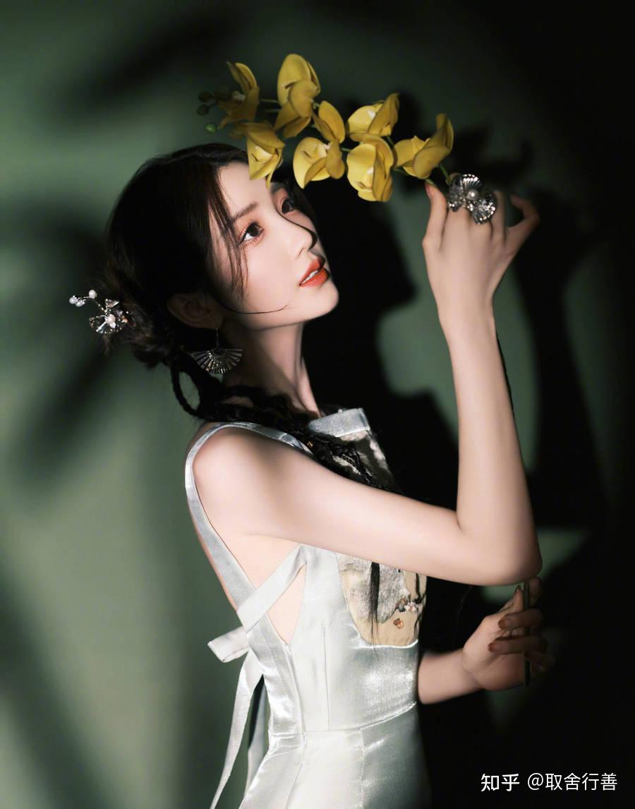 照片中的她,身穿露背连衣裙,手拿花朵,举过头顶,皮肤白皙,晶莹剔透,吹弹可破,冰肌玉骨,宛如西游记中的杏花精。