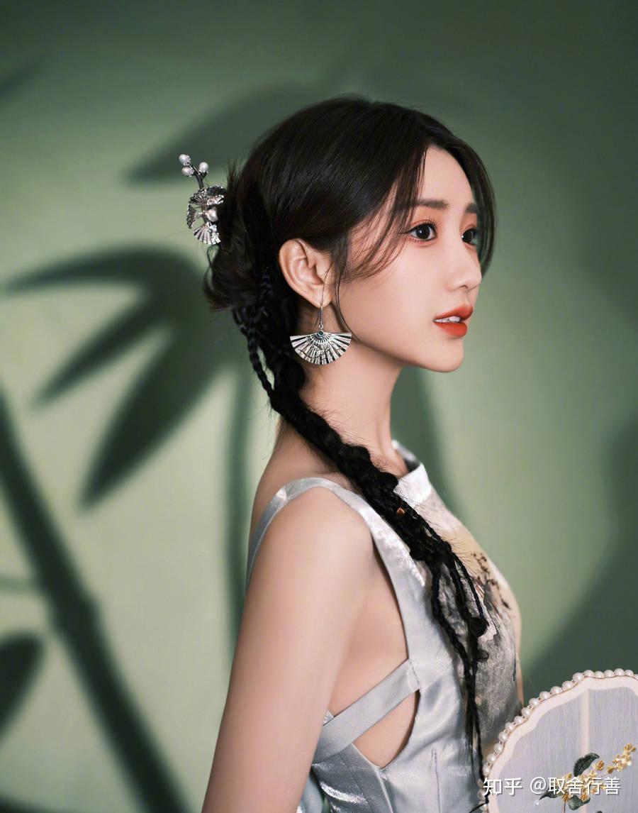 照片中的她,身穿露背连衣裙,用古扇挡住半边脸,古装造型美艳动人。