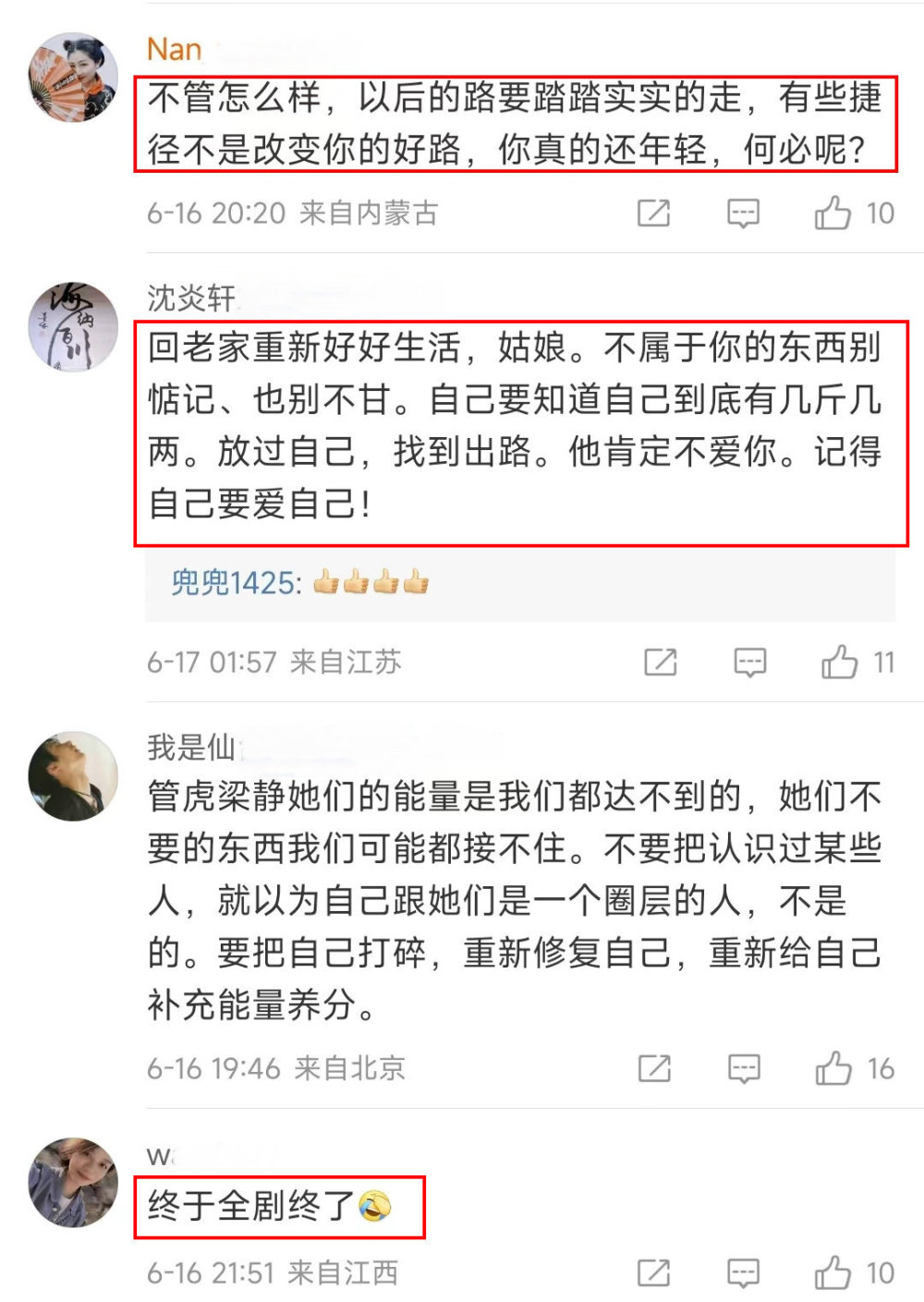 对于丁昱彤的发文,网友们纷纷留言安慰。开导她人生要往前看,希望她珍爱生命。还劝她说,放下对管虎的执念,未必不是好事。