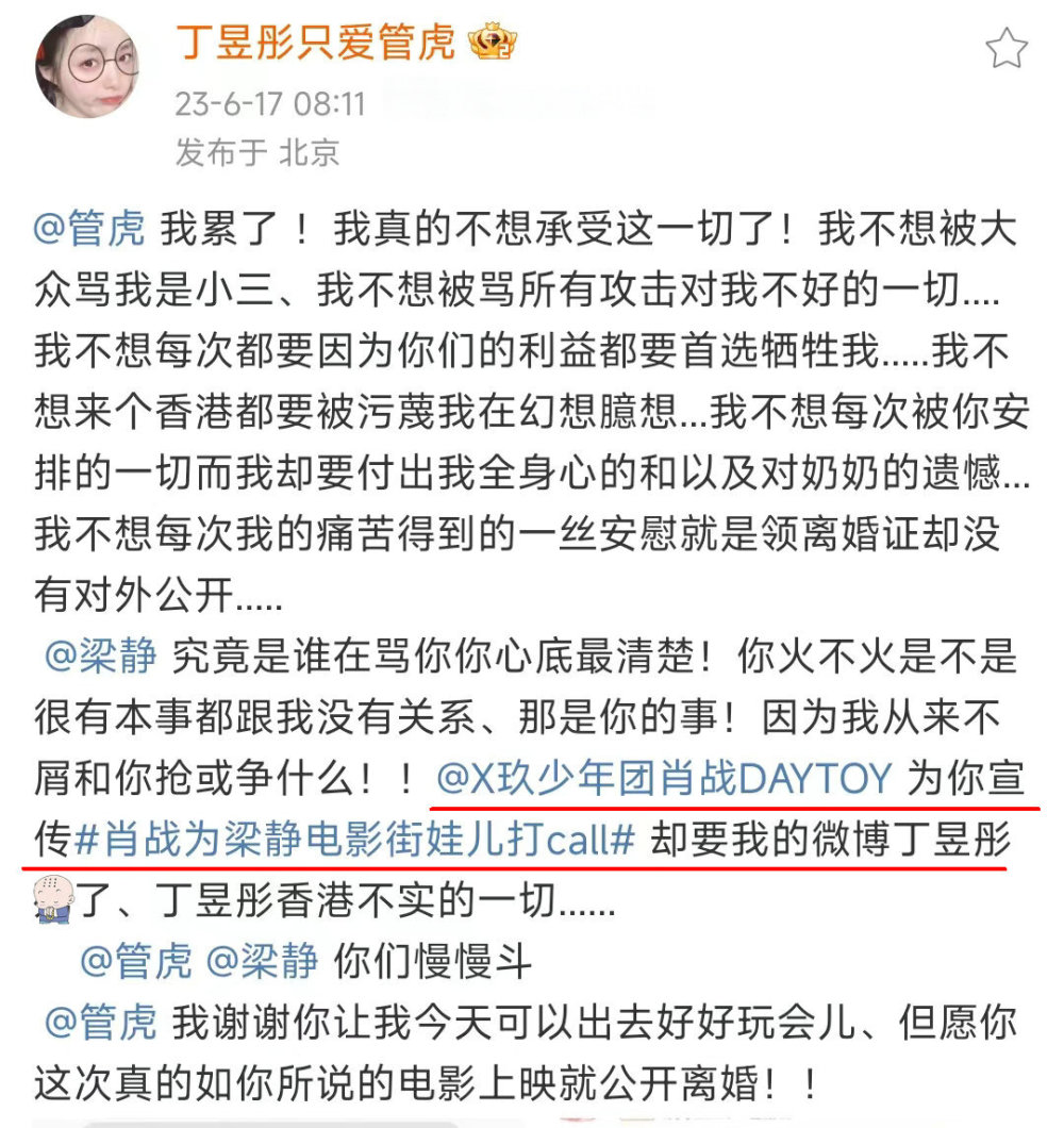 最后,丁昱彤说希望管虎和梁静慢慢斗,也希望管虎说话算话,电影上映就公开离婚。