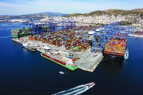 作为“一带一路”倡议的典范项目,希腊比雷埃夫斯港已成为地中海地区领先的集装箱大港之一、欧亚双向陆海联运通道新枢纽? 新华社发
