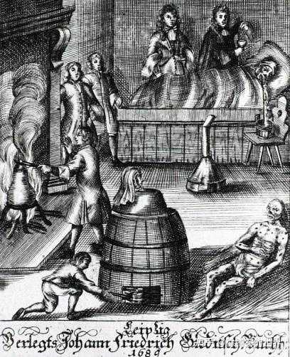 自梅毒降临人间以来,人类便使出浑身解数与之搏斗,为此付出了巨大的代价。作为一种新产生的恶疾,最初欧洲人对其感到束手无策,产生了各种怪异的治疗方法,不少庸医把病人医死。如用烧红的烙铁把肿包烫焦,只是疾病没有去除,病人已被折磨的半死。还有类似巫术的方法,如用蜘蛛网和紫色的细绳覆盖溃烂的地方,或者是将煮沸的蚁巢与蚂蚁一起服用等等。