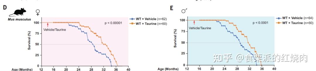 在小鼠身上,牛磺酸使28个月的小鼠(老年)预期寿命增加了18-25%,平均寿命增加了10-12%。