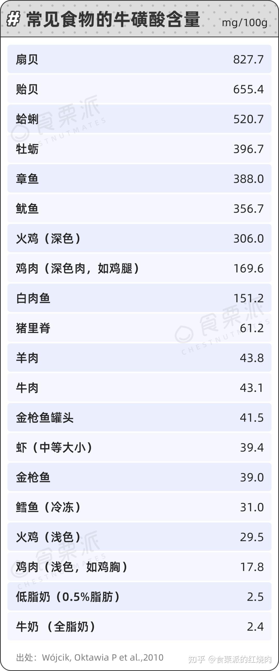 牛磺酸主要来自动物性食物,植物中的含量很低或不能检出。