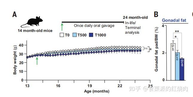 ▲按每公斤体重每天摄入1000mg的剂量(深蓝色)补充的小鼠,老后发福更少。参考资料[1]