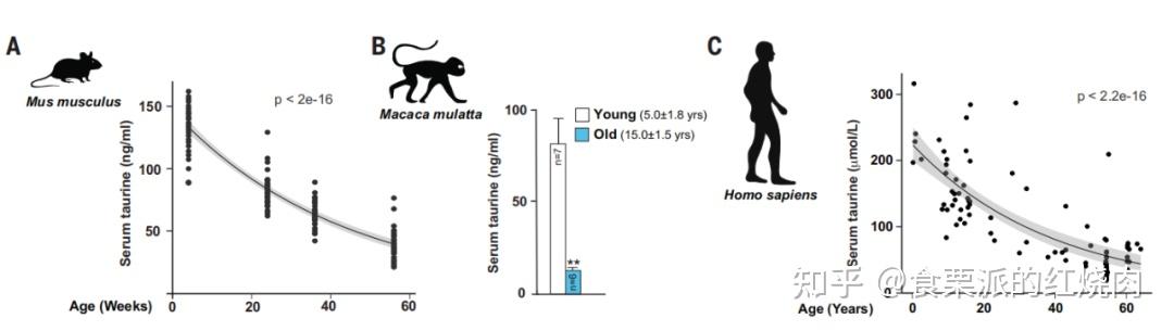 研究人员发现:中年小鼠的牛磺酸只有幼年小鼠的30%,而对于猴子和人类,老年人较年轻人,牛磺酸浓度下降率在80%以上。