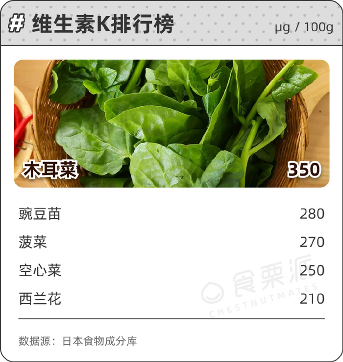 绿叶菜、嫩豆中的维生素K比较丰富。羽衣甘蓝、豆瓣菜、小白菜、韭菜、四季豆、生菜等蔬菜的维生素K含量在160μg/100g以上。