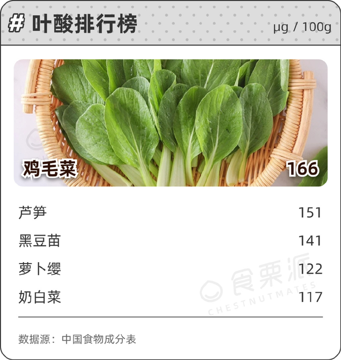蔬菜中,叶酸含量最丰富的就是各种绿色的叶菜和嫩豆类。除了上榜单的5种蔬菜之外,羽衣甘蓝、菠菜、西兰花、茼蒿、嫩蚕豆、豌豆苗、乌塌菜、秋葵等,也都富含叶酸。