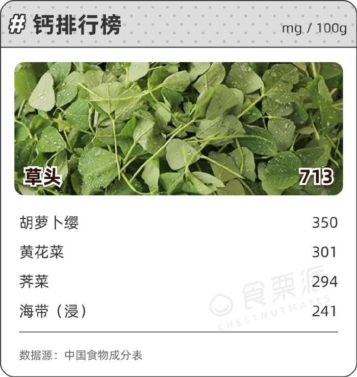 另外,蔬菜中的钙、镁、膳食纤维等营养素含量也很高。很多蔬菜的钙含量跟牛奶比,也毫不逊色。虽然吸收率没法比,可胜在含量高啊。
