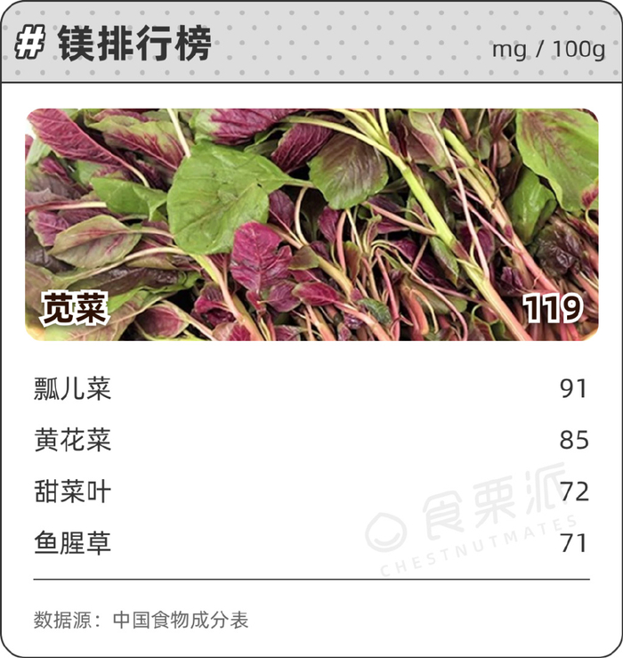 蔬菜中,绿叶菜的镁含量最丰富的,除了榜单上的这几位,镁含量高的还有木耳菜、菠菜、芹菜叶等。