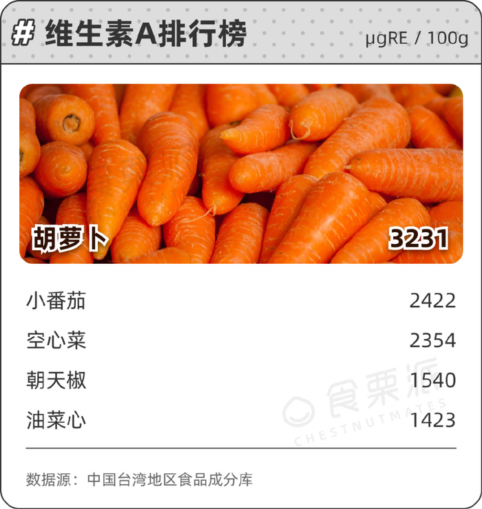 绿色、黄色、橙色的蔬菜都含有丰富的β-胡萝卜素,除了表格上的,香椿、苋菜、豆瓣菜、茼蒿、菠菜、南瓜等的β-胡萝卜素含量也很丰富,都在3000μg/100g以上;