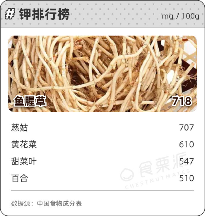 比如,草头、胡萝卜缨、毛豆、菱角、羽衣甘蓝、蚕豆、抱子甘蓝等蔬菜的钾含量都超过了350mg/100g,赶紧吃起来吧。