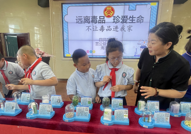 活动现场,巾帼志愿者为未成年人详细讲解禁毒知识、毒品的种类、成分、吸毒后的状态和对个人、家庭、社会的危害,以及未成年人应该具备的识毒、防毒技巧,禁毒相关法律法规等知识。现场摆放仿真毒品模型,生动形象地将禁毒宣传内容呈现在未成年人眼前,告诫未成年人,一定要学会自我保护,提高对诱惑的警惕性,采取坚决拒绝的态度,不要轻信谎言,筑起“识毒、拒毒、禁毒、防毒”的铜墙铁壁,“不让毒品进我家”,远离毒品,珍爱生命,健康成长。