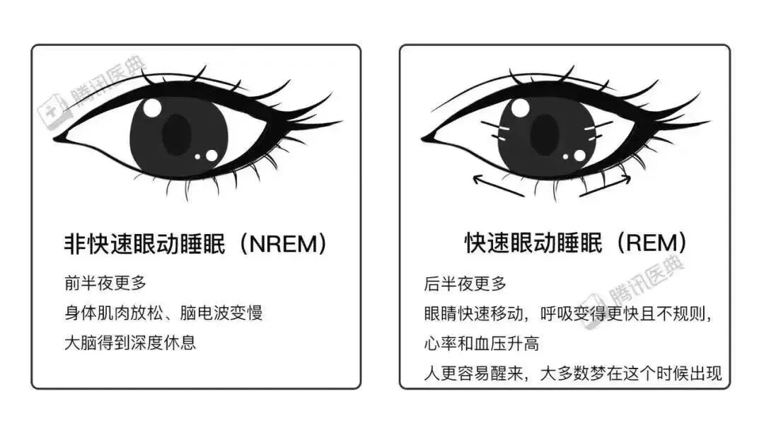 一个睡眠周期被分为2个型态:快速眼动睡眠期(REM睡眠期)和非快速眼动睡眠期(NREM睡眠期)。
