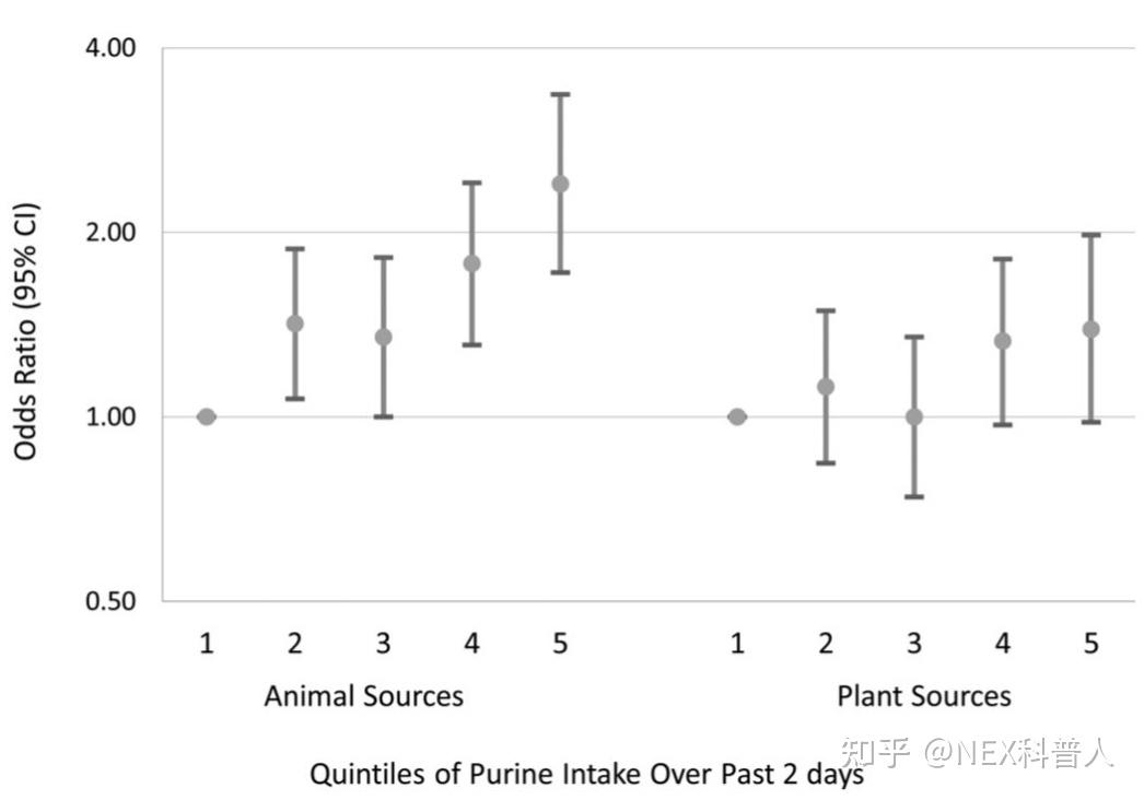 为了探讨和量化痛风患者嘌呤摄入量与痛风复发风险的关系,Zhang Y 等进行了一项病例交叉研究,与 2 天内总嘌呤摄入量最低的五分位数相比,动物嘌呤摄入最高五分位数的患者痛风风险升高 141% (p <0.001),植物嘌呤摄入最高五分位数患者的痛风复发风险升高 39% (p=0.04)[13]。