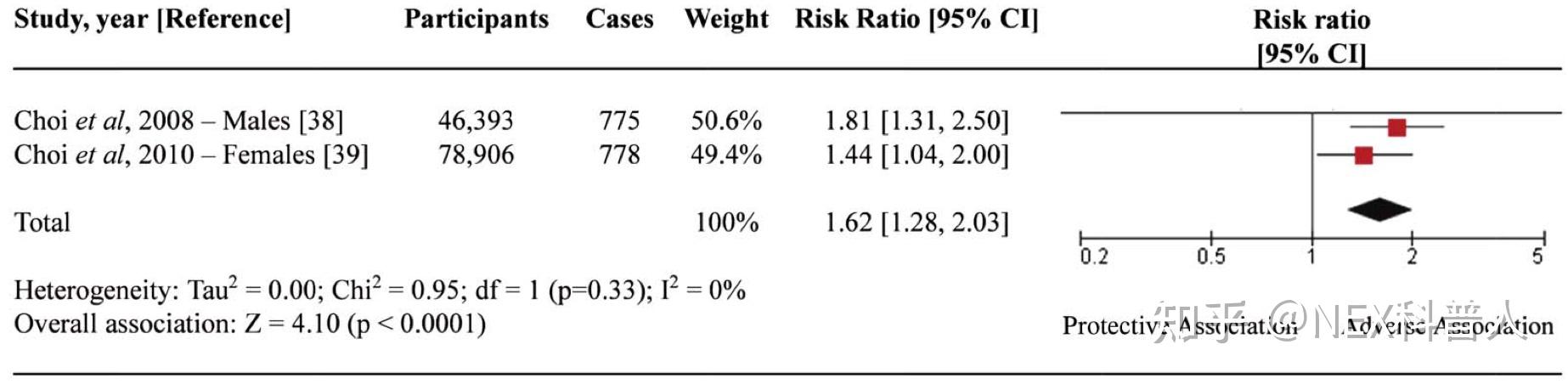 2 项研究涉及 12299 名参与者和 1533 例突发痛风病例,在平均 17 年的随访中评估了果糖摄入与突发痛风之间的关系。发现果糖摄入与痛风风险增加相关,摄入果糖可使痛风风险升高 62%(RR=1.62, 95% CI 1.28至2.03,p<0.0001)