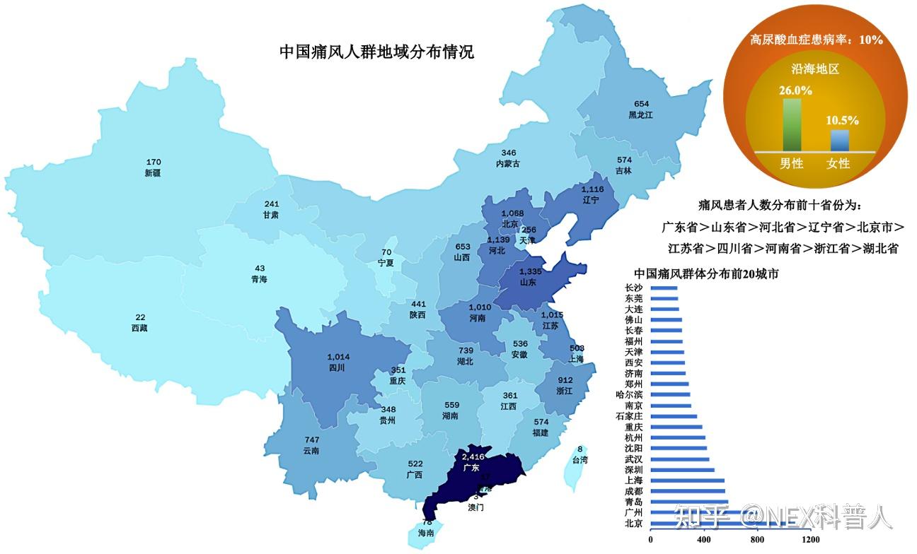 流行病学数据说明,在我国的沿海省份、经济发达省份的痛风患者最多
