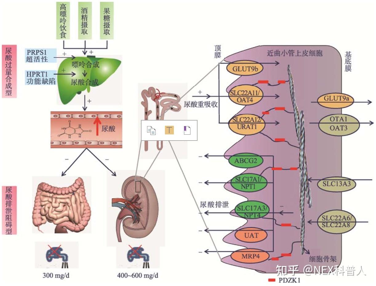 尿酸过量合成型:主要是由于磷酸核糖焦磷酸合成酶(Phosphoribosyl pyrophosphate synthetase 1, PRPS1)和次黄嘌呤/鸟嘌呤磷酸核糖转移酶(Hypoxanthine phosphoribosyl transferase 1, HPRT1)等单基因突变、高嘌呤饮食、酒精和果糖的摄取等直接或间接地影响嘌呤合成代谢,导致尿酸生成过量尿酸排泄阻碍型:由于参与尿酸排泄和重吸收的转运蛋白发生改变引起血液中的尿酸排泄障碍。