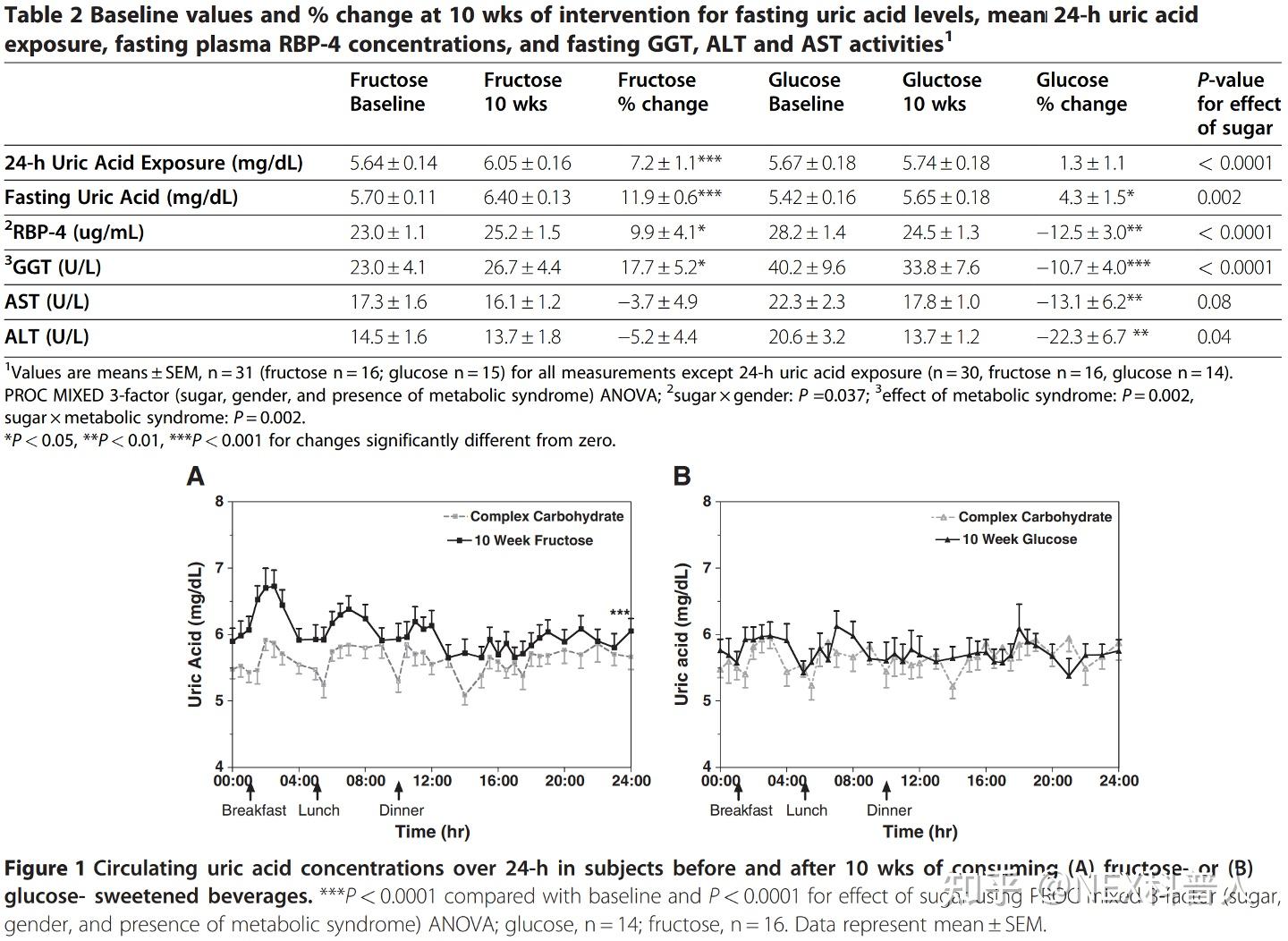 中间代谢产物是合成尿酸的中间产物,也就是说吃太多果糖的话,会导致尿酸合成增多,导致血尿酸水平升高,促进血尿酸进入关节内[22]会抑制参与尿酸排泄的基因表达和活性,尿酸排泄减少,导致血尿酸浓度升高,促进血尿酸进入关节内[23]会抑制参与尿酸排泄的基因 ABCG2的表达和活性,抑制尿酸从滑囊液进入血液,同时可以激活NF-κB信号通路,分泌炎性因子,导致急性痛风发作[24]Cox CL 等研究人员分析了 10 周果糖或葡萄糖摄入对男女血浆尿酸的影响,发现摄入果糖,而不是葡萄糖,导致 24 小时血尿酸谱(P < 0.0001)显著变化。果糖和葡萄糖均能升高空腹血尿酸,果糖升高血尿酸能力更强[25]。