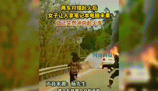 2023年4月3日,四川广安一车辆起火,据了解,女子欲超车与对向车辆相撞,随后车辆冒烟起火,女子让对向车主去车上帮她拿回笔记本电脑被拒,冲向起火车辆欲拿笔记本电脑,被消防员飞奔拦下,所幸未造成人员伤亡。