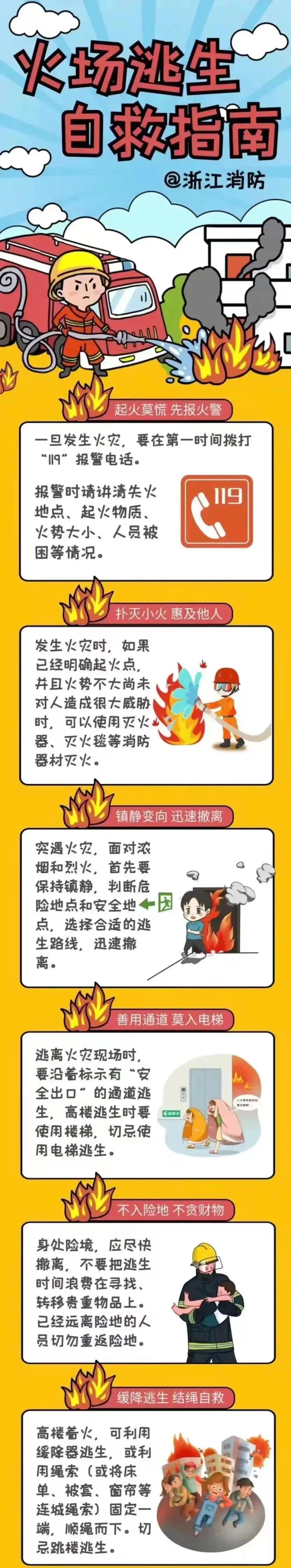 火场千万不要轻易做出跳楼的决定。可自制结绳试着扒住阳台或窗台翻出窗外,以求绝处逢生。