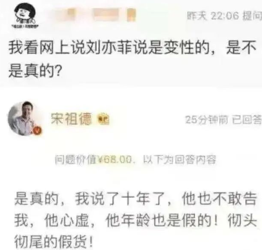2005年时,宋祖德公开造谣刘亦菲是变性人,且列出了种种证据,称刘亦菲偷偷去美国做过2次变性手术。