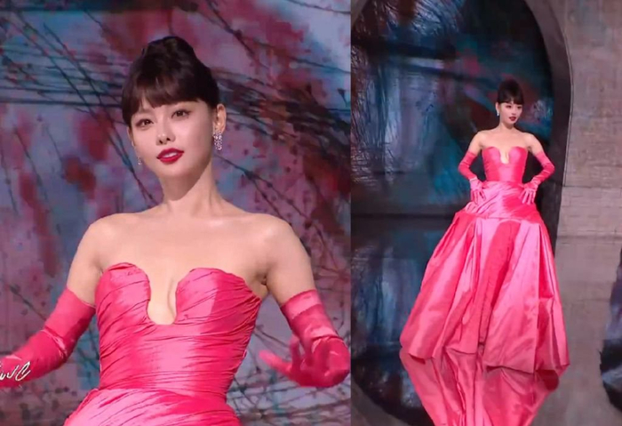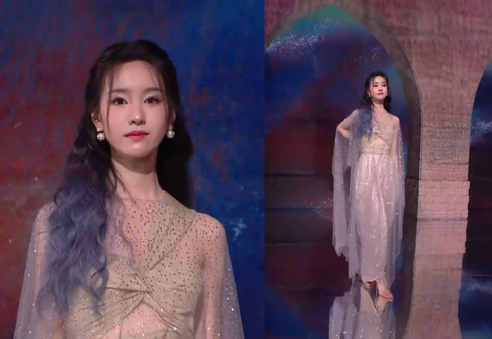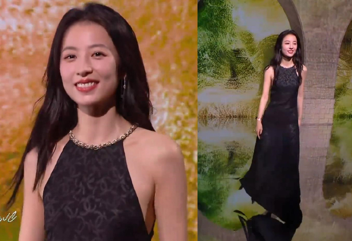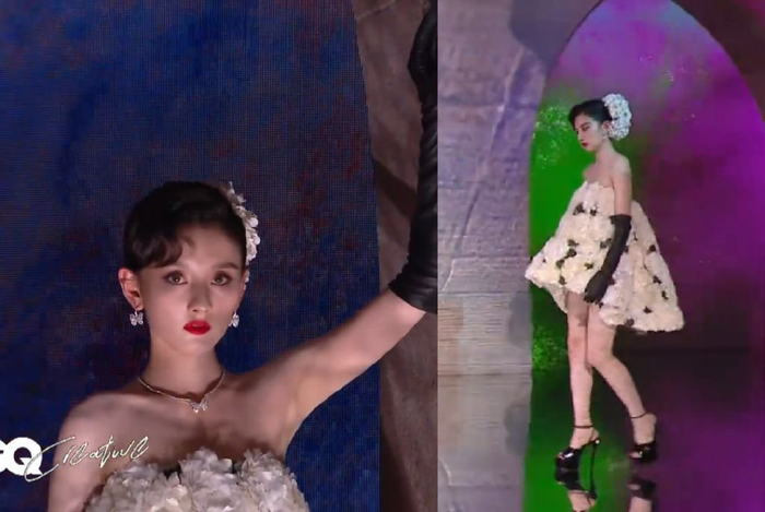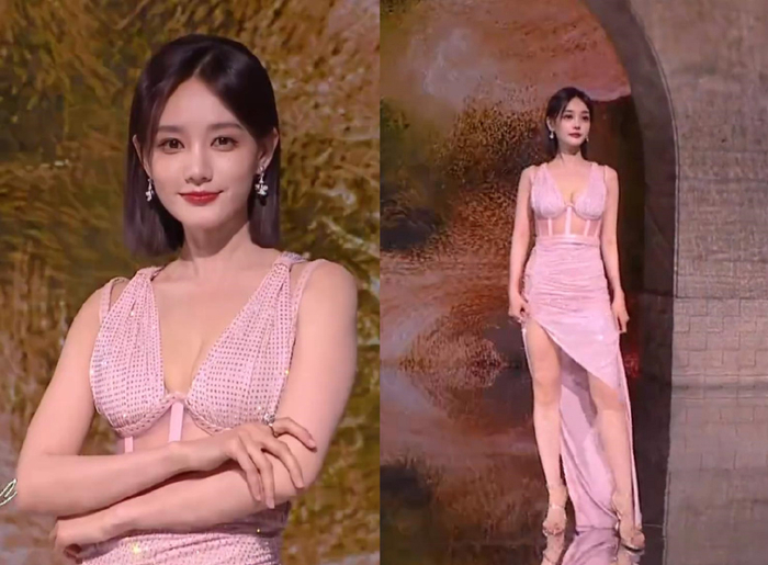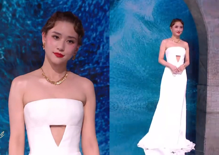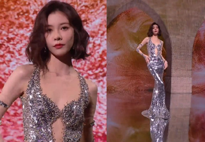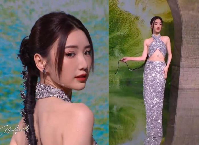 李一桐上场的时候,她那甜美的长相和这件性感的礼服违和感满满,妆发和表情如此正经,礼服却透出一股狂野大胆,搭配在一起只能说是强行走性感风了。