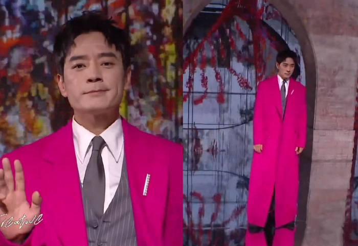 李光洁用比较常规的条纹马甲搭配玫红色长款西装外套,很有个性,只是远远看着会像穿了浴袍。
