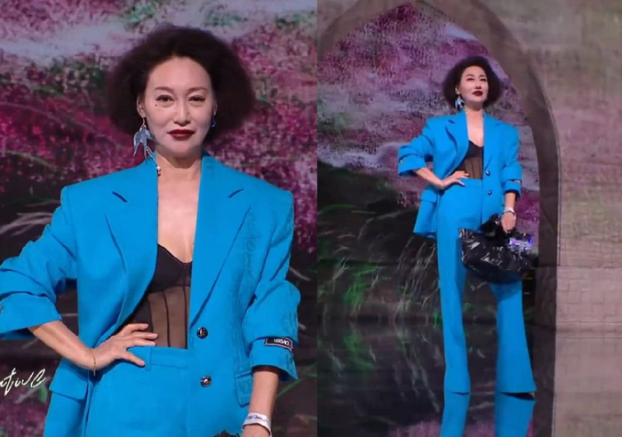 惠英红一出场,气场秒杀很多女明星,她明明是来参加时尚盛典的女明星,硬是走出了来收购杂志的气势。这套蓝色西服适合表现力很强的她,复古中带点性感,不会让人觉得浮夸。