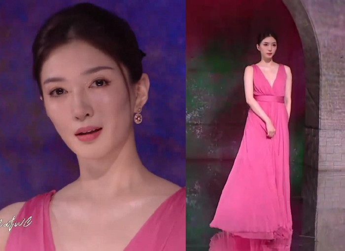 一向貌美的江疏影,用清透的妆容搭配简约的深V背心长裙,白皙的肌肤跟玫红色很配,似乎毫不费力就散发出明艳大美女的气场。