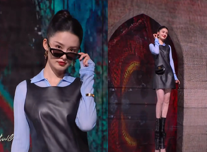 李沁的造型给人一种俏皮少女的感觉,蓝色衬衫搭背心皮裙时尚又好看,只是跟她冷清的气质真的不搭,一来她没有少女感,二来她不俏皮。