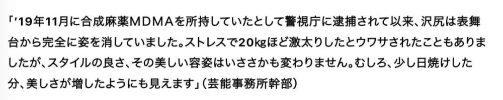 虽然拿到了期盼的大河剧主角资源,表示愿意为这部剧牺牲一切…但2019年11月,泽尻因持有大麻和MDMA在公寓被捕,在尿检结果是阴性的情况下承认自己吸毒10多年,大麻、MDMA、可卡因都有,并且不打算戒掉…