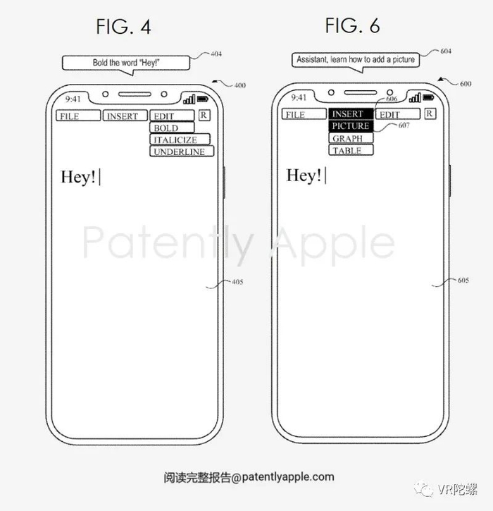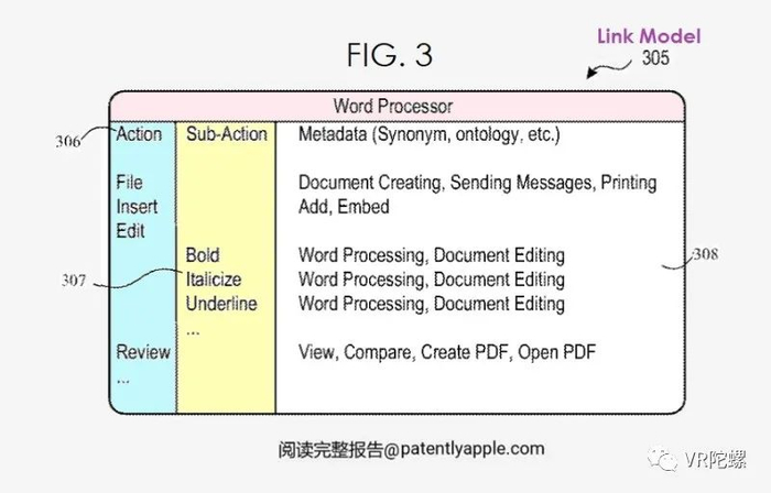 如上图4所示,系统可以接收语音输入#404“将单词Hey!加粗”。Siri可以处理口语输入,以确定该命令是“加粗”,但可能不理解 “加粗”命令的含义,或根据该命令执行什么动作。因此,系统和Siri可以通过访问“链接界面”来确定为命令“加粗”所要执行的行动,如下面专利图3所述。