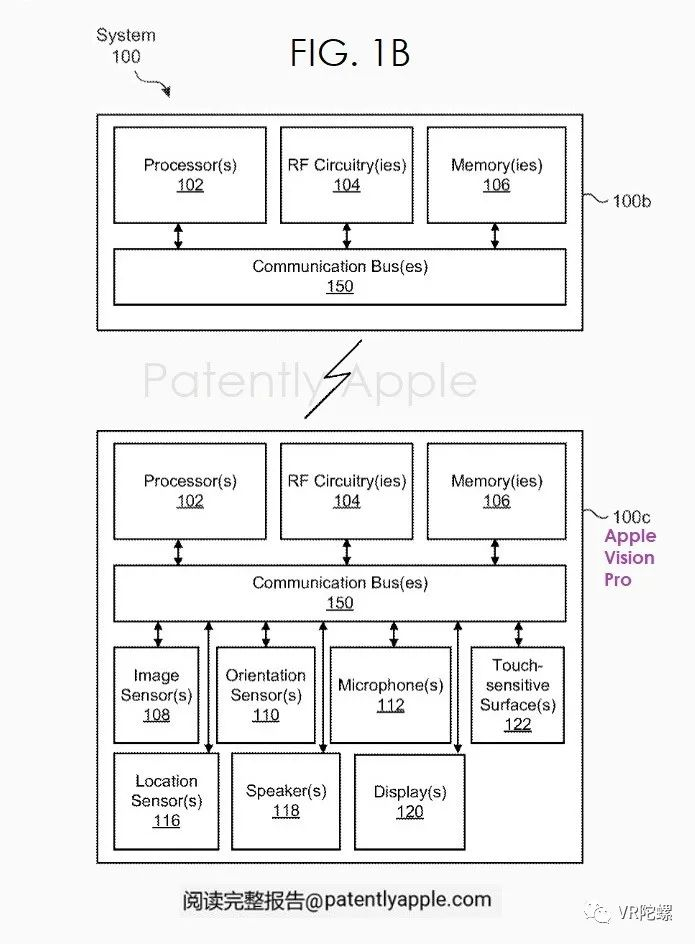 苹果公司希望用其即将推出的Vision Pro空间计算头显解决这个问题。苹果在专利图1B中指出,系统#100包括两个(或多个)通信设备。第一个设备#100b(例如,基站设备)包括处理器(可以是有线或无线的)。第二设备#100c(例如,头戴式设备)包括各种部件,如处理器、射频电路、存储器、图像传感器、方向传感器、麦克风、位置传感器、扬声器、显示器等等。