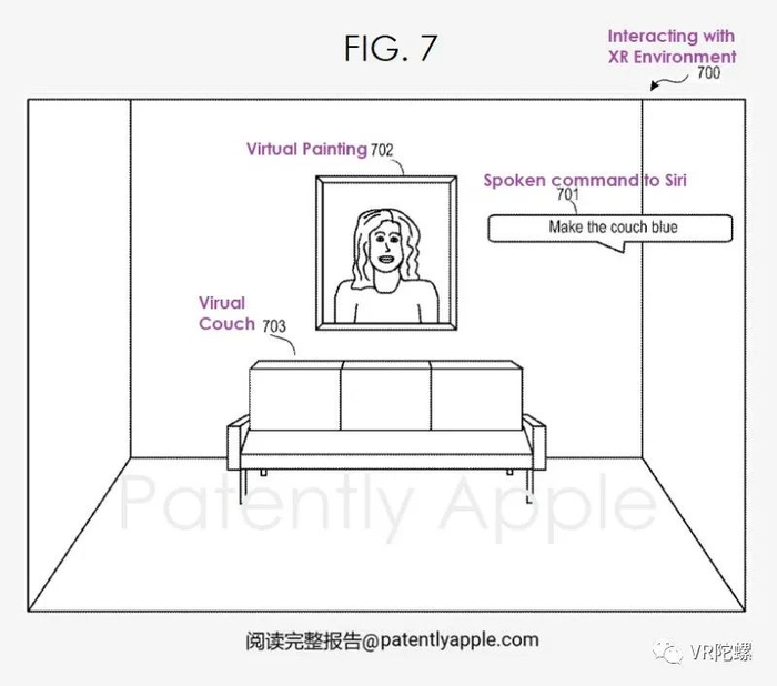 在苹果的专利图7中,Apple Vision Pro可以产生一个VR环境,包括一个或多个虚拟物体,Siri可以根据用户的输入进行交互。在一些例子中,头显可以生成或接收虚拟环境的视图,包括一个或多个虚拟物体。例如,如图7所示,头显可以接收视图#700,包括虚拟绘画#702和虚拟沙发#703。