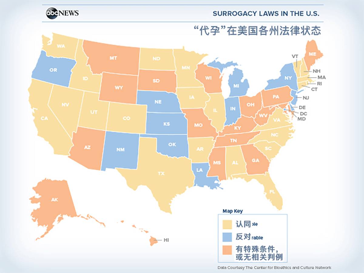 比如亚利桑那州婴儿属于生母,科罗拉多州婴儿可以在出生前由协议确定母亲是谁,而阿拉巴马州则需要等婴儿出生以后再通过收养程序转移母亲的身份,或者在加利福尼亚州由法律明确规定如何通过协议确定母亲的身份。同时,还有一些态度含糊的州,母亲是谁一旦出现争议,要通过法院判决决定,法院判决并没有可预期的结果。