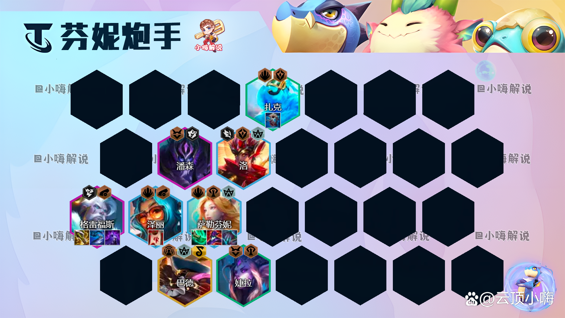 霞的体系是最克制芬妮炮手的,特别是有2-3家芬妮炮手的时候,就玩传统的冒险怒霞,大成2星希瓦娜+赫卡里姆的控制就能够让芬妮炮手喝一壶了,除非有3星芬妮才可能55开,否则全员2星冒险霞是吊打芬妮炮手的。